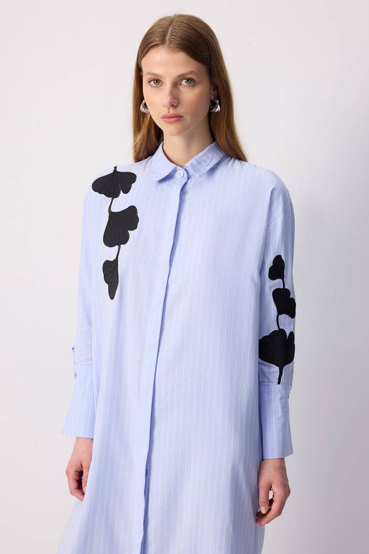Botanisches Applikations-Langhemdkleid – Nadelstreifen: Mavi / S