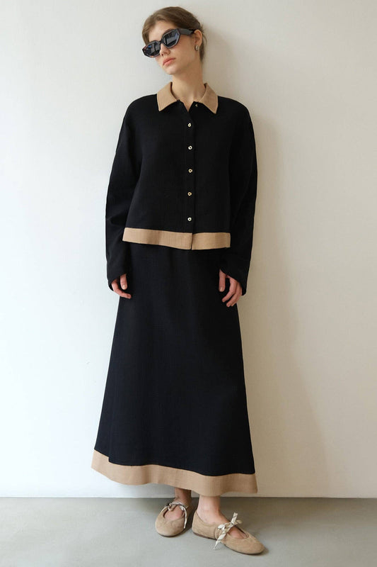 100 % BAUMWOLLE STRUKTURIERTES HEMD UND ROCK SET: Siyah / S
