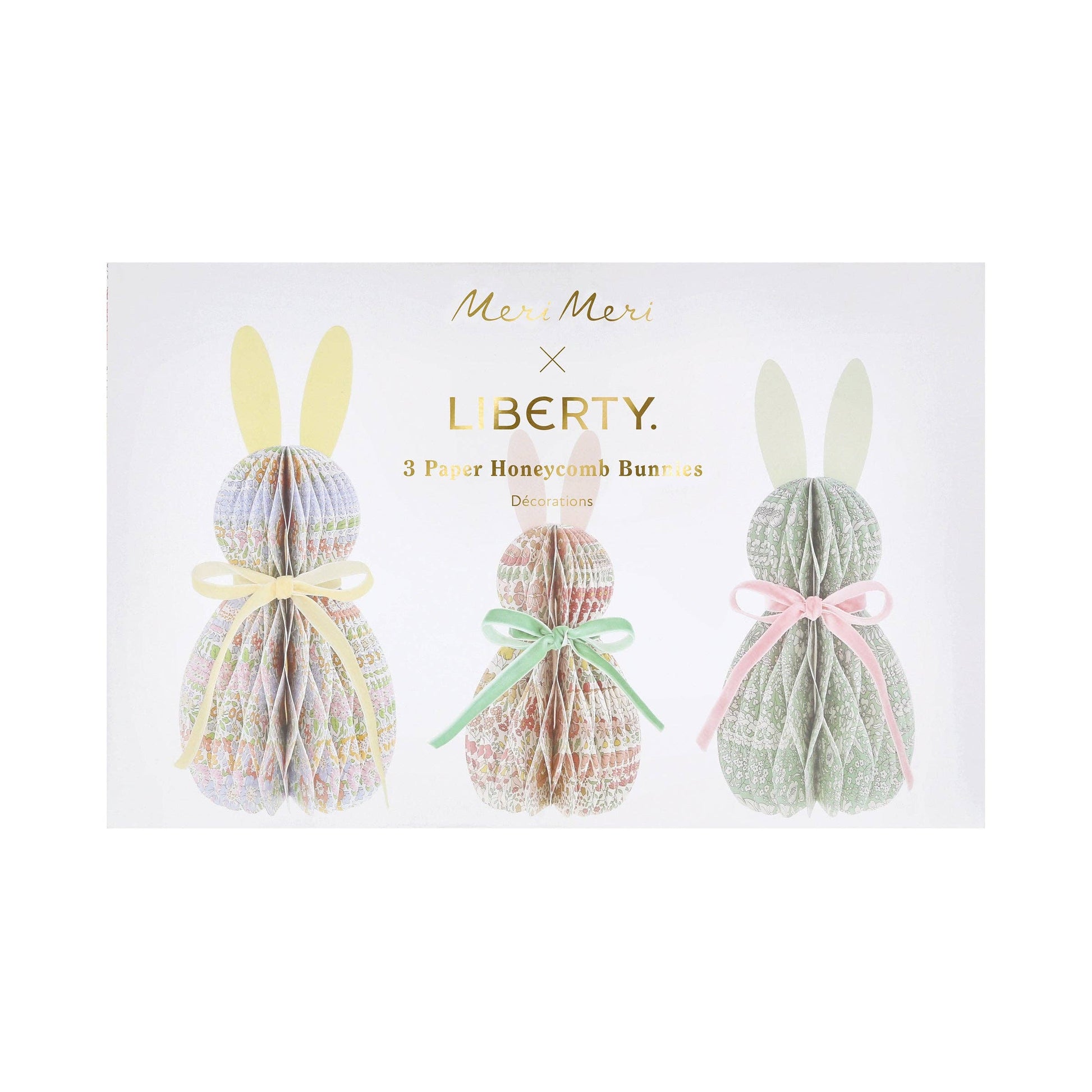 * Ein Set aus drei Wabenpapier-Hasen in drei Größen, jeweils mit einem anderen Liberty-Blumendesign